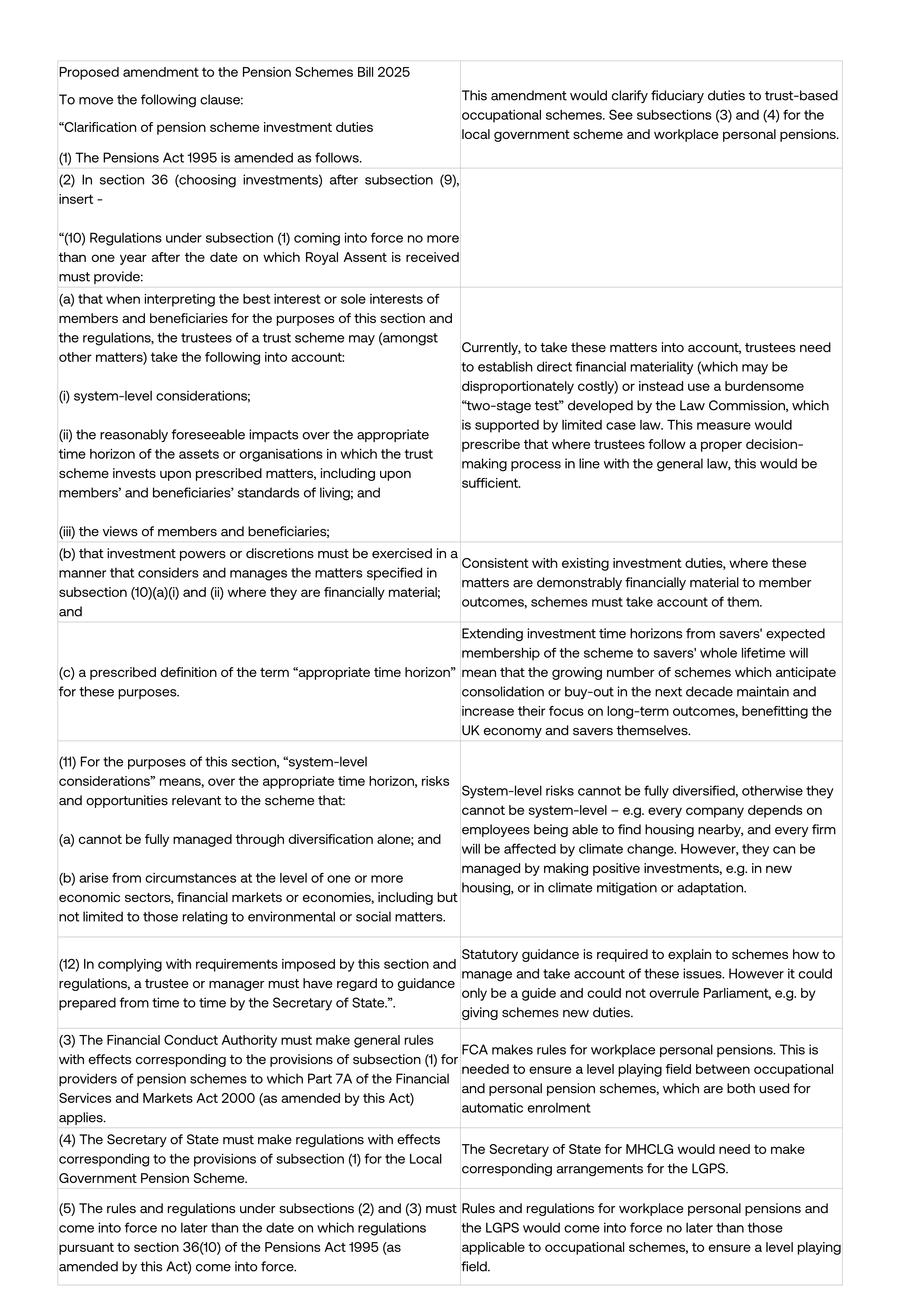 To ensure that pension schemes are voluntarily able to invest productively in members’ interests, including in the UK economy, we encourage Peers to support and speak to amendment xxx which would provide clarification of fiduciary duty in law, rather than via guidance alone.
